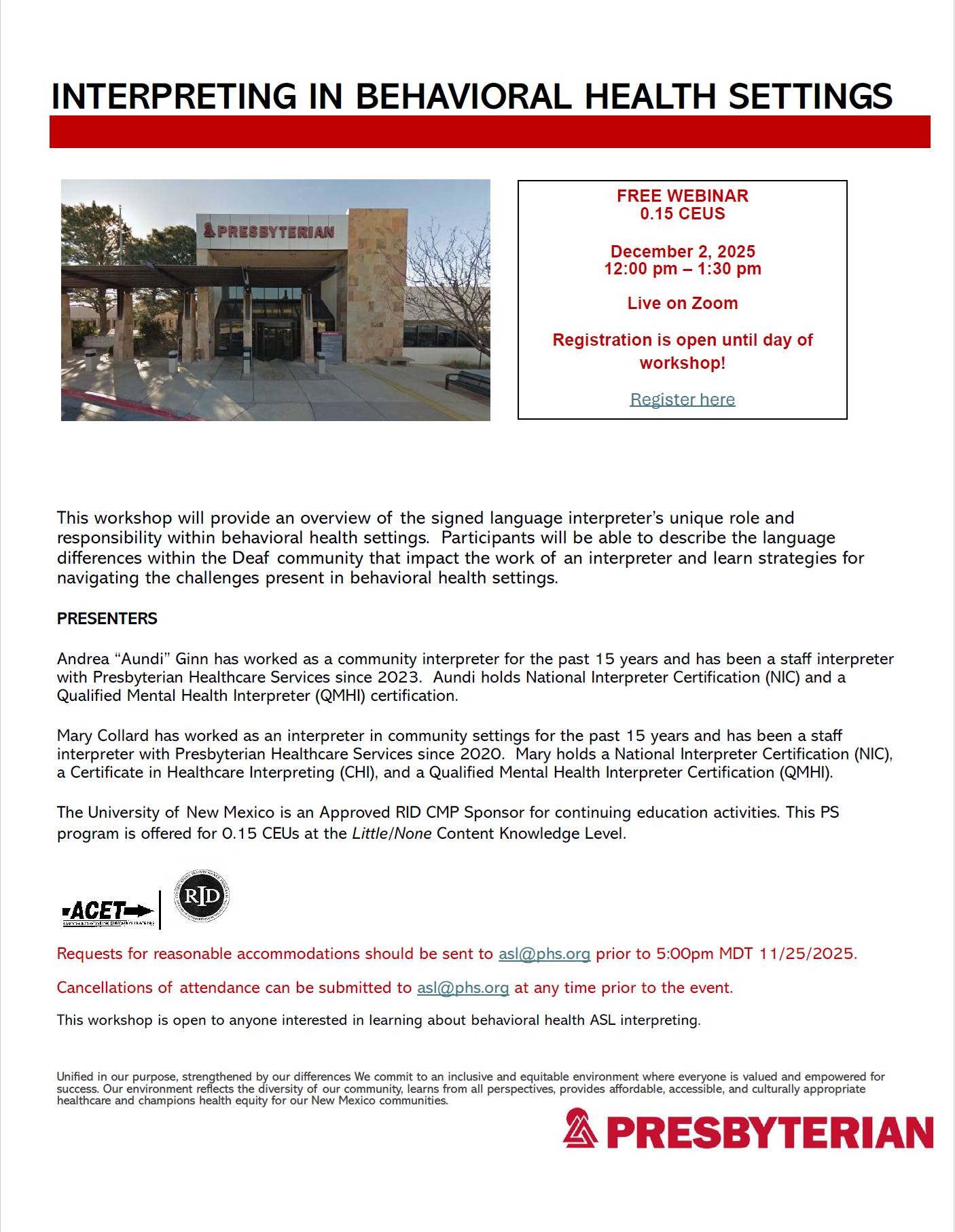 Presbyterian Health Services is offering a free webinar about Interpreting in Behavioral Health Settings on December 2, 2025 from 12pm to 1:30pm. Register here: https://phs.zoom.us/j/96126856270.
