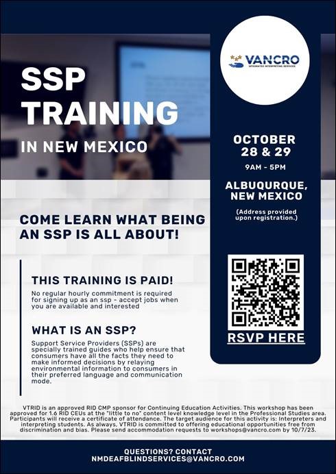 Vancro will be hosting an in person, two-day SSP training October 28th & 29th in Albuquerque, NM. This training is open to signing and non-signing folks. 1.6 RID CEUs are available for ASL interpreters.